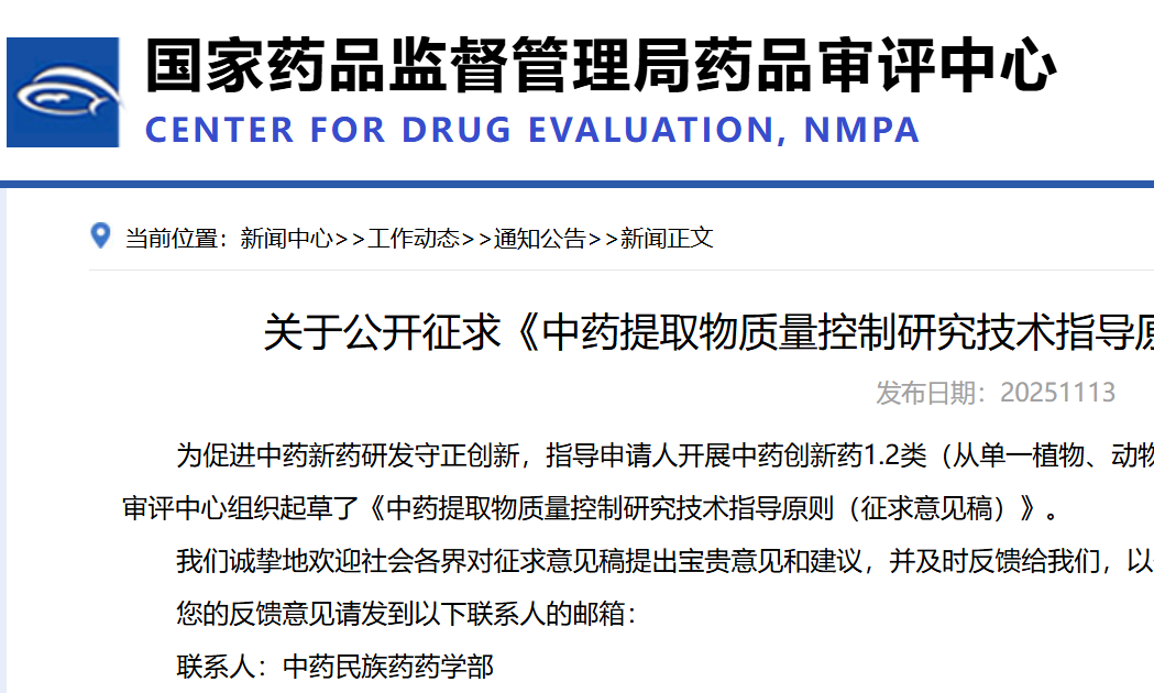 关于公开征求《中药提取物质量控制研究技术指导原则(征求意见稿)》意见的通知